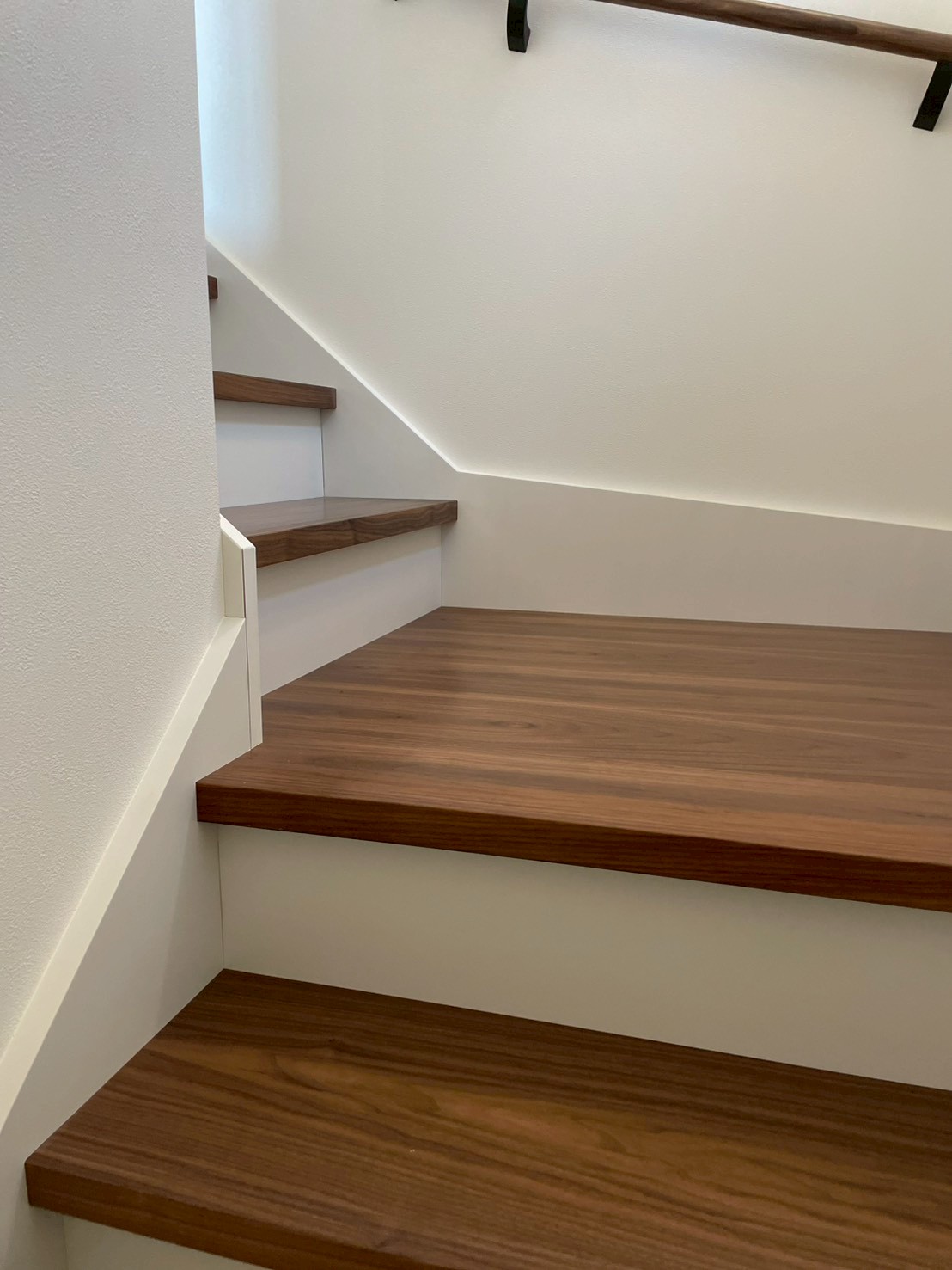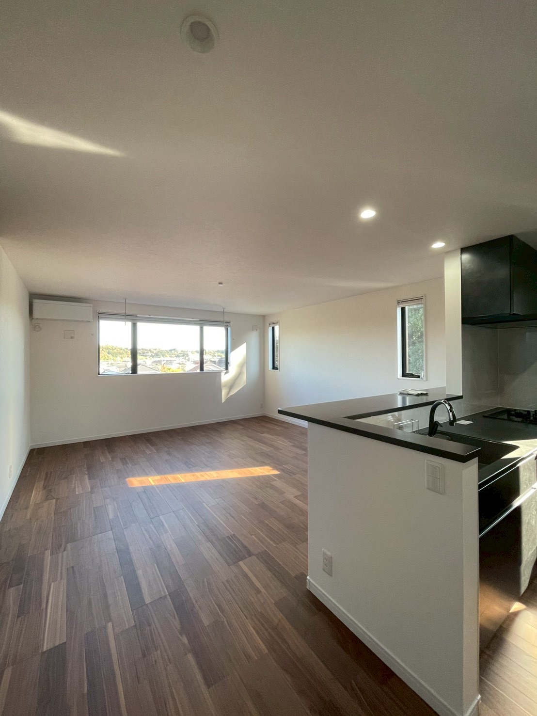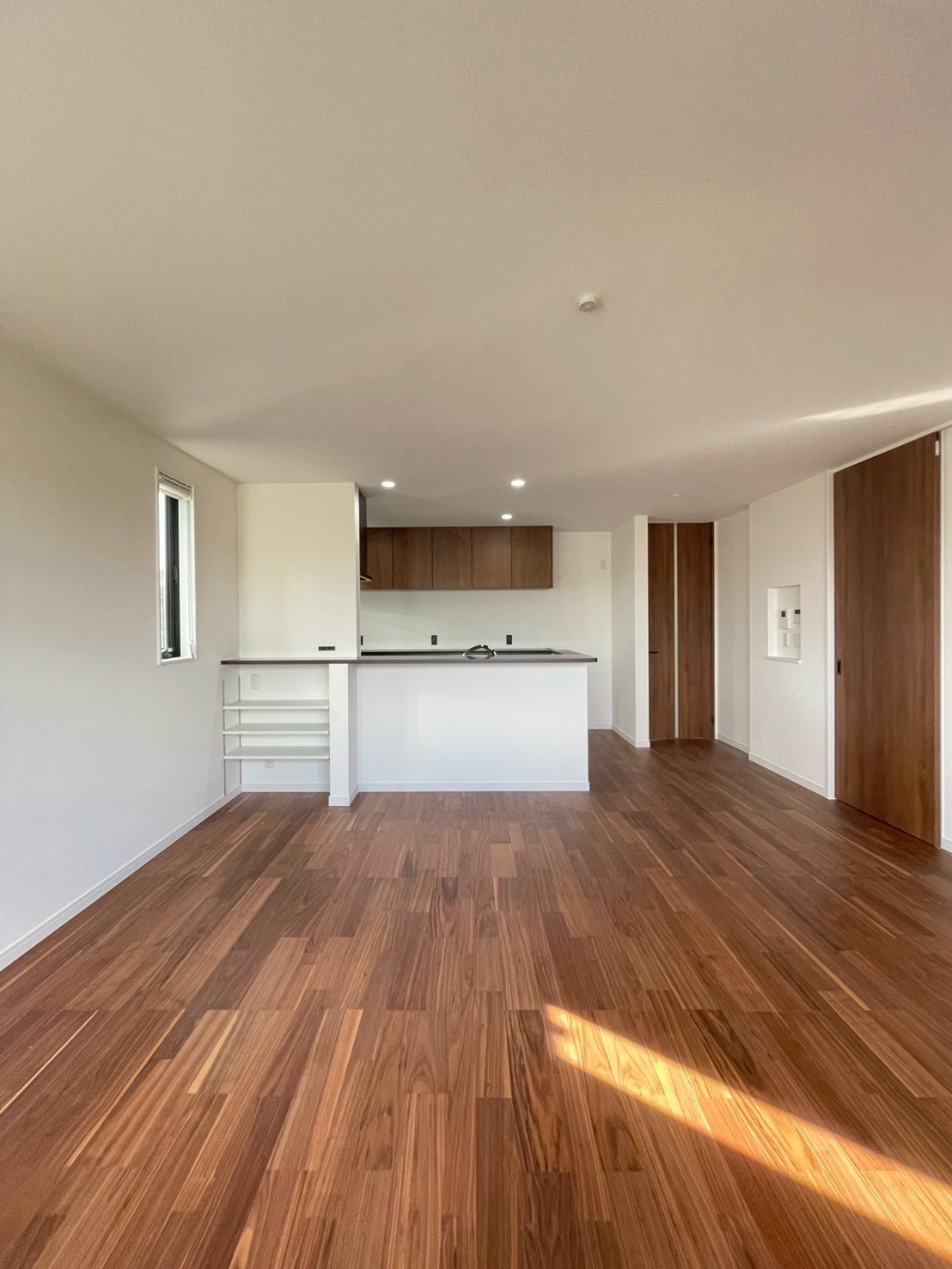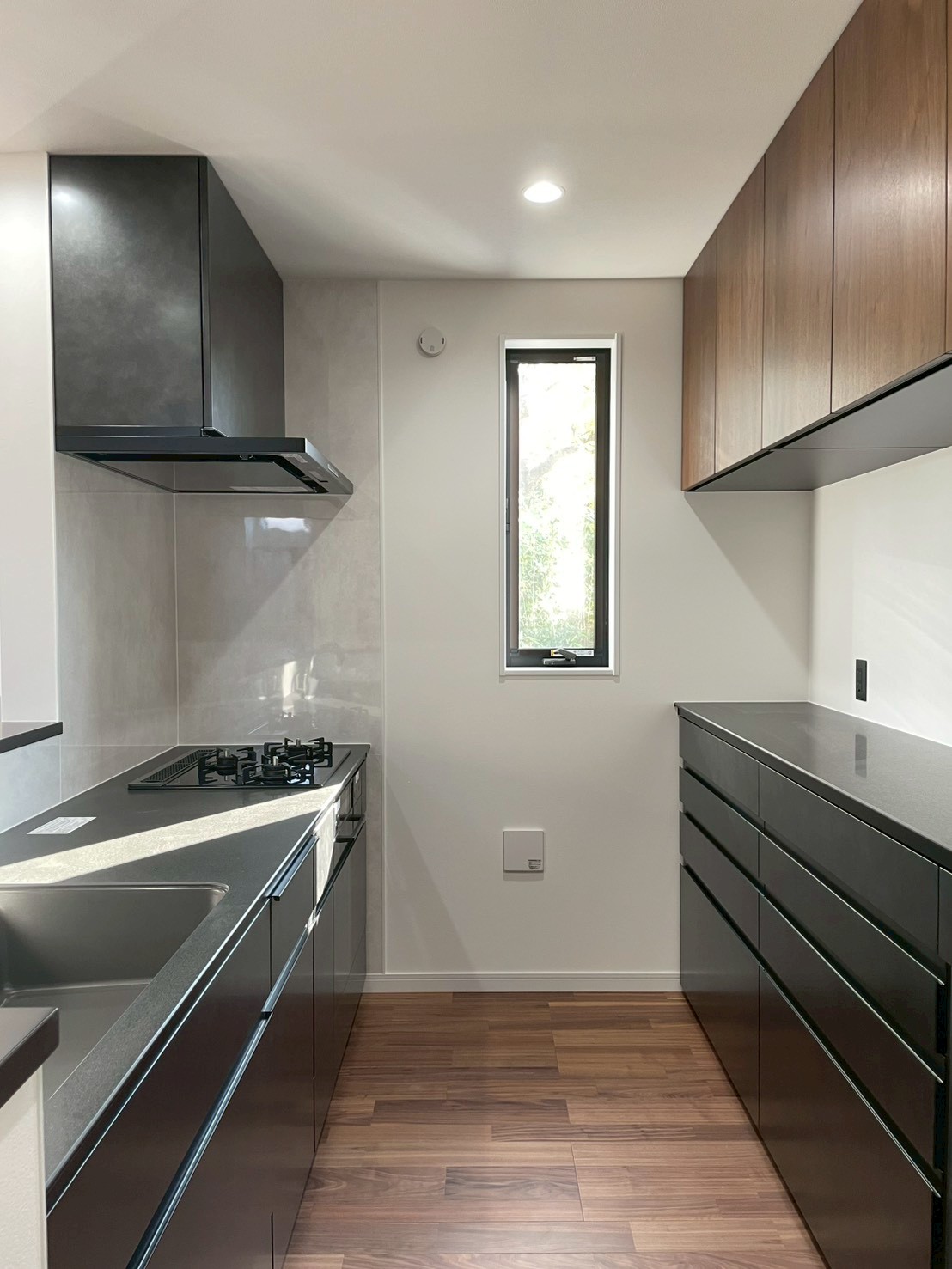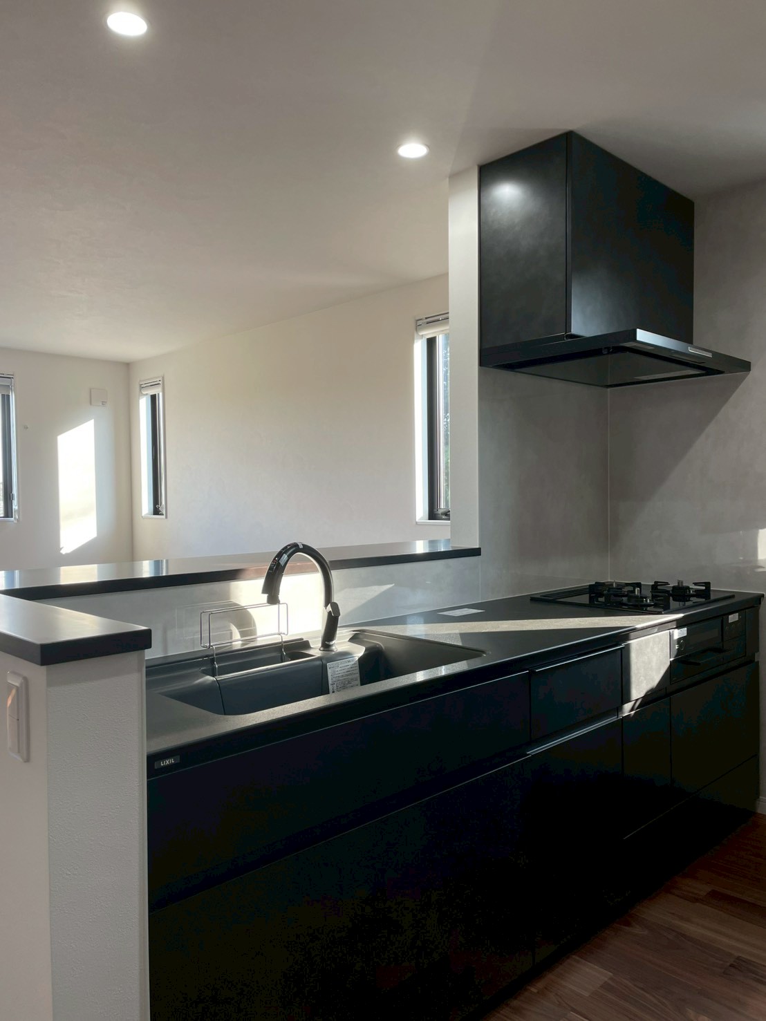 室内に足を踏み入れると、あたたかみのある無垢調フロアと白壁がひろがる、明るいLDKが迎えてくれます。ブラックで統一したキッチンは、リビングを見渡せるオープンスタイル。すっきりとしたラインと豊富な収納で、日常の家事もスマートにこなせます。
