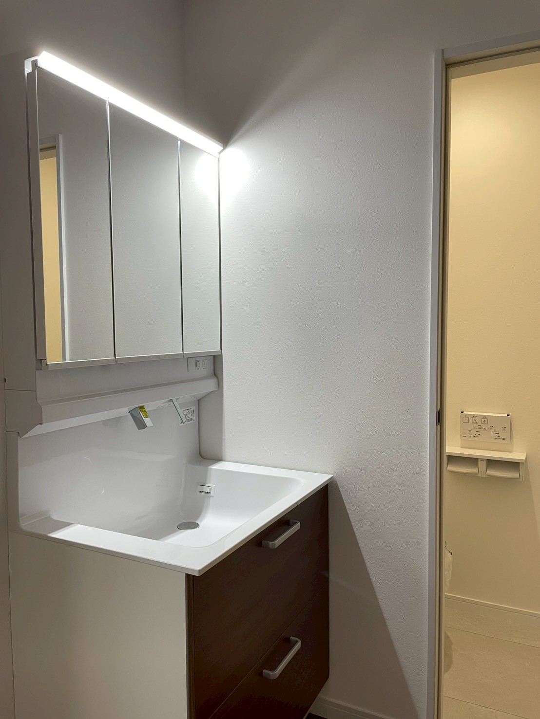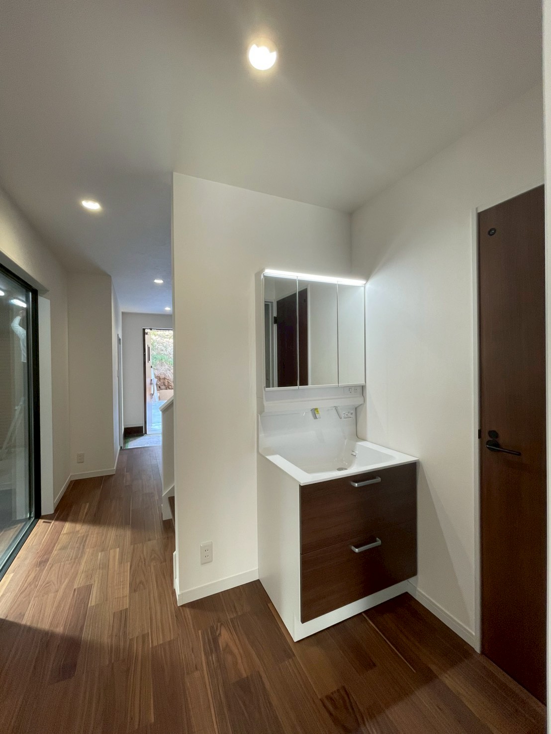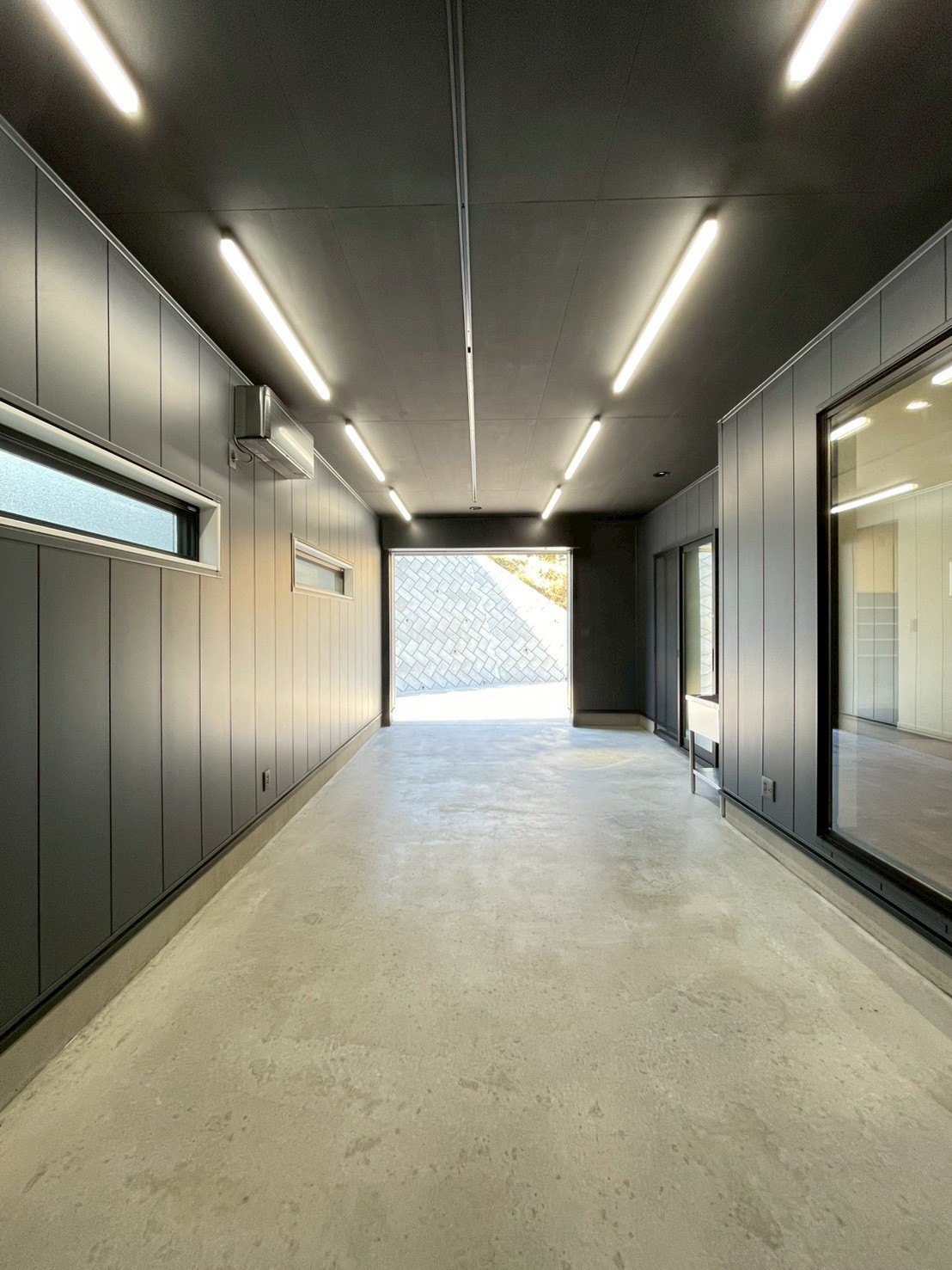 天井まで走るライン照明、ダークトーンでまとめた壁と天井、無骨なコンクリート土間。車やバイクを愛でるガレージとしてはもちろん、アウトドアギアのメンテナンス、DIY、趣味のアトリエ、ホームジムなど、ライフスタイルに合わせて自由に使える“もうひとつのリビング”です。シンクやエアコンも完備しているので、季節を問わず快適に没頭できます。