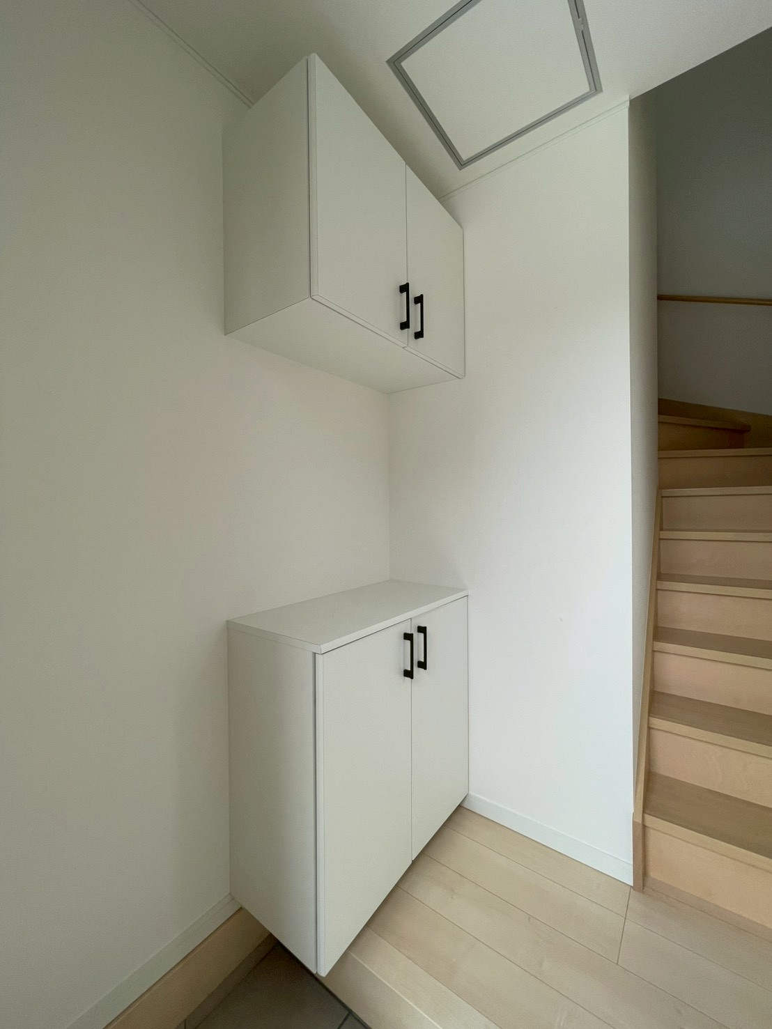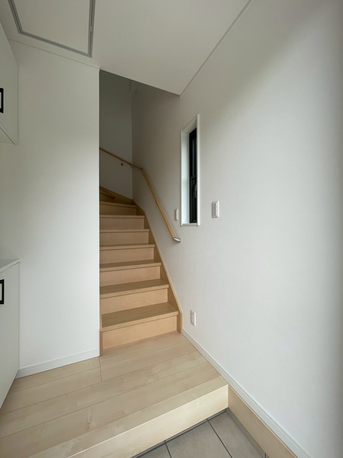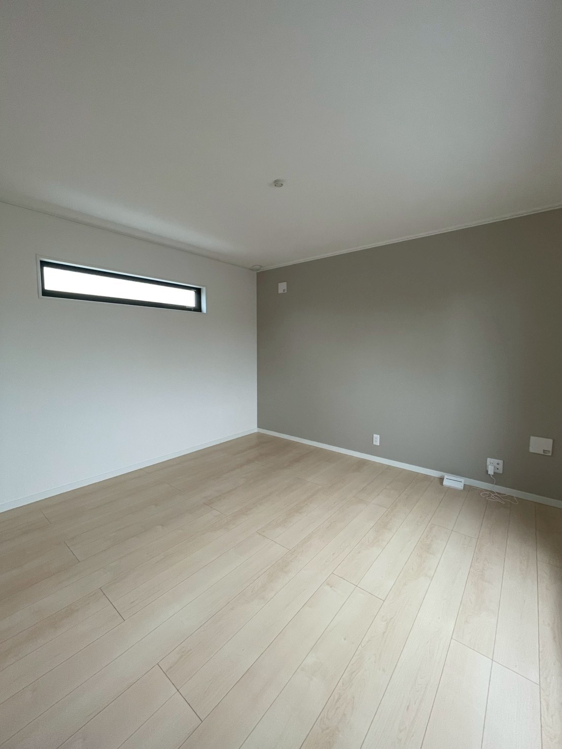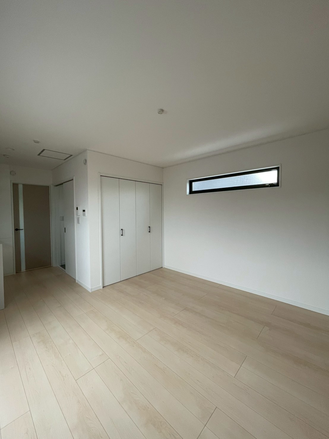 2階は一転して、やわらかな木目床とニュアンスグレーのアクセントウォールが穏やかな雰囲気の居住空間。横長スリット窓からやさしい光が入り、プライバシーを保ちながら心地よく過ごせます。たっぷりの収納も備え、生活空間はいつもすっきり。