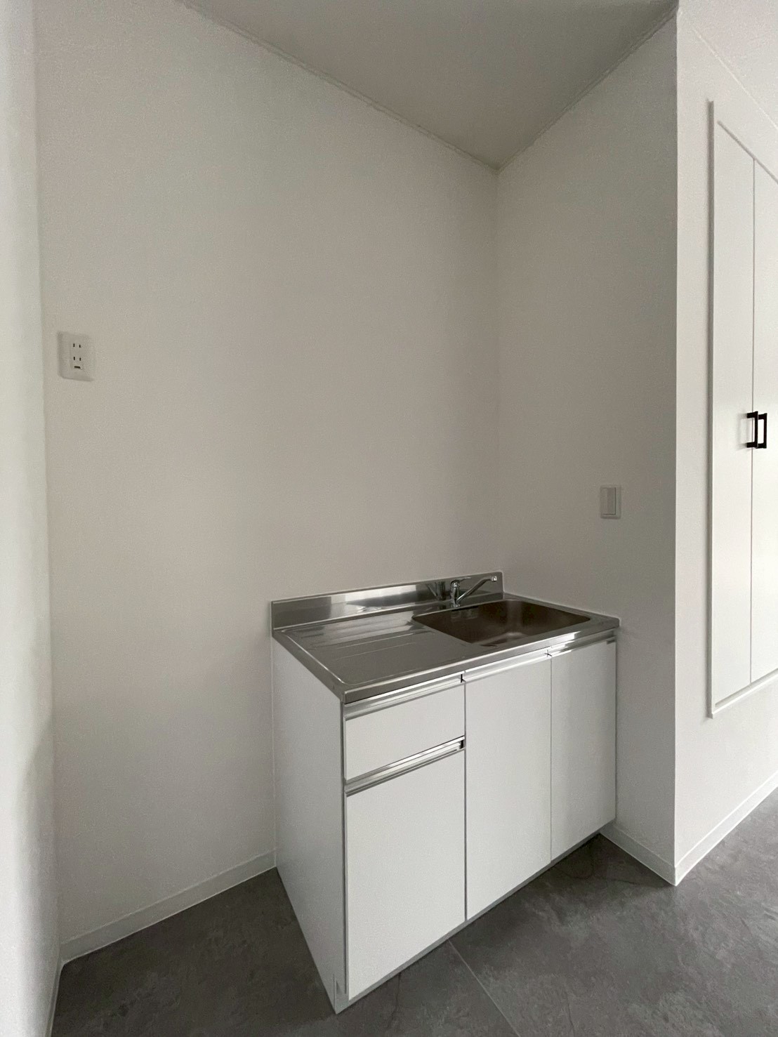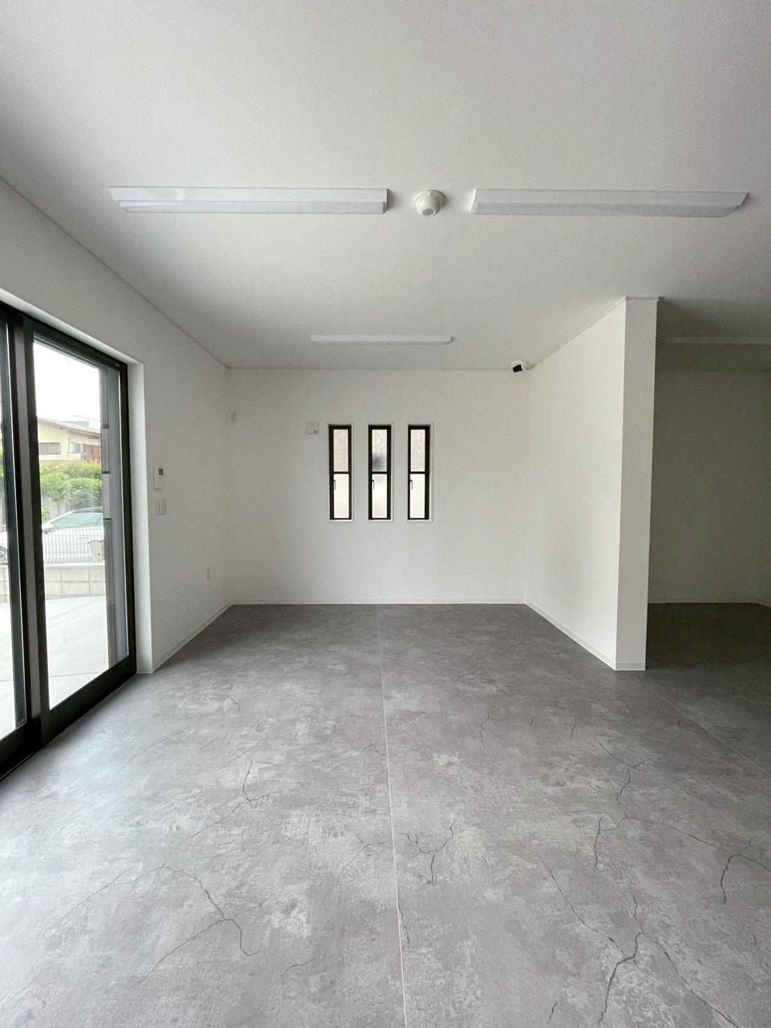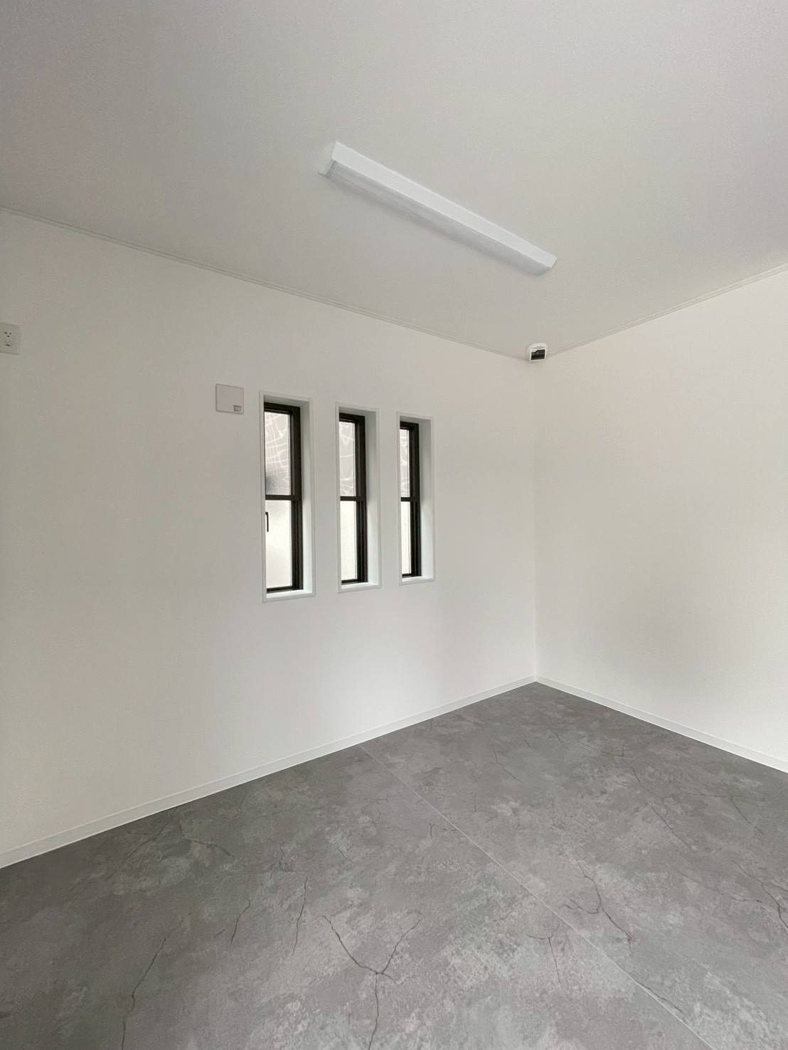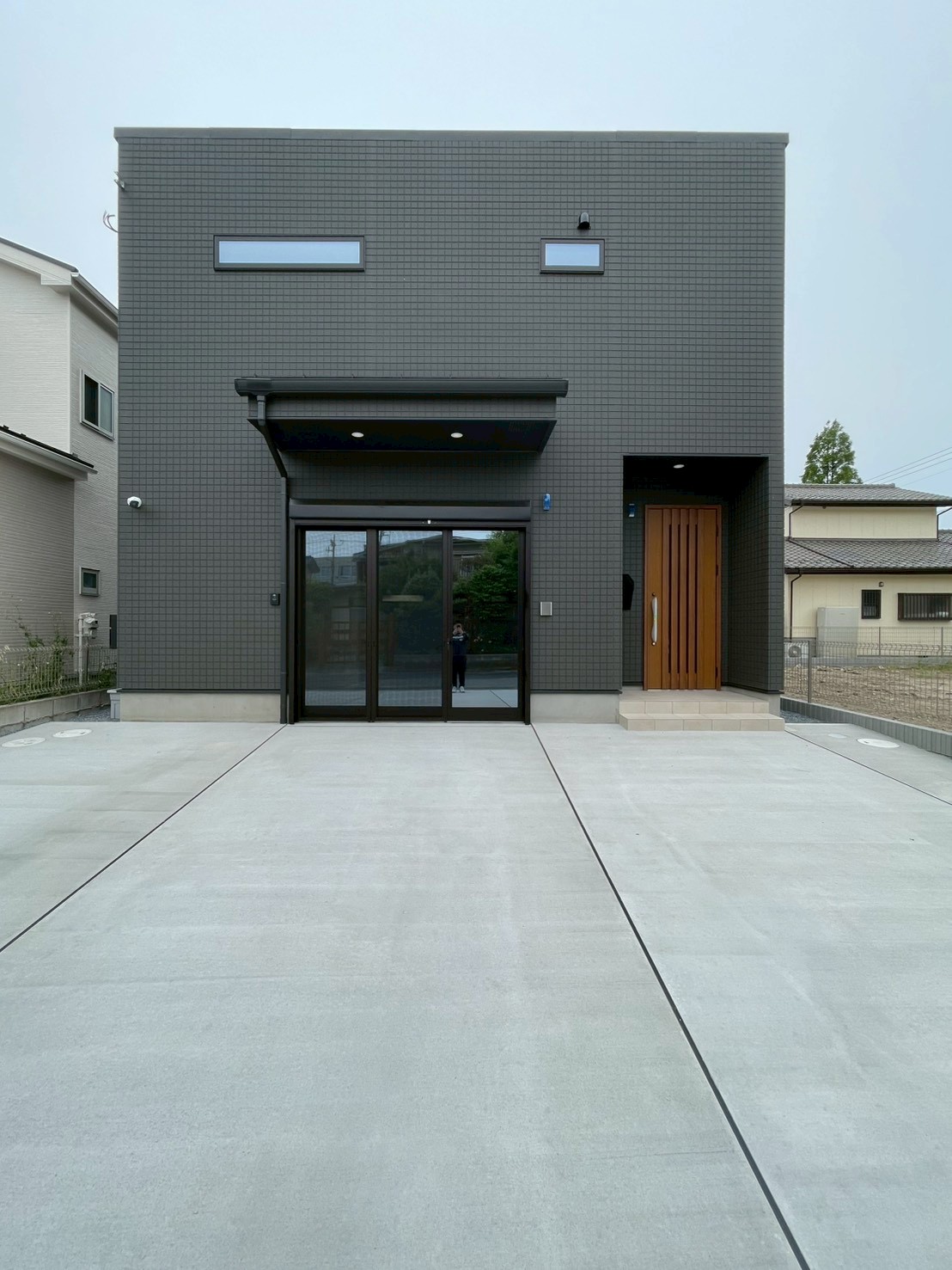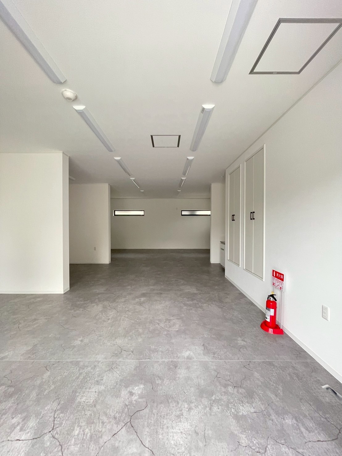 扉を開けると、まず迎えてくれるのは広々とした1階フロアです。コンクリート調の床と白い壁でまとめたシンプルな空間は、ショップやサロン、オフィス、スタジオ、趣味のガレージなど、使い方次第で表情を変える“フリースペース”。窓からの採光と均一に配置された照明で、作業性も高く、仕事場としてもイベントスペースとしても活躍します。