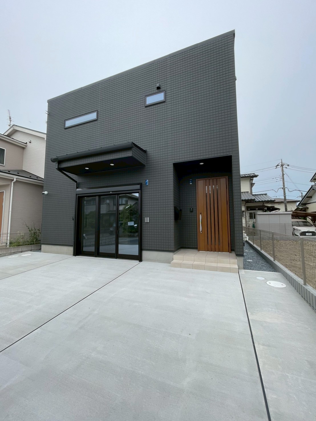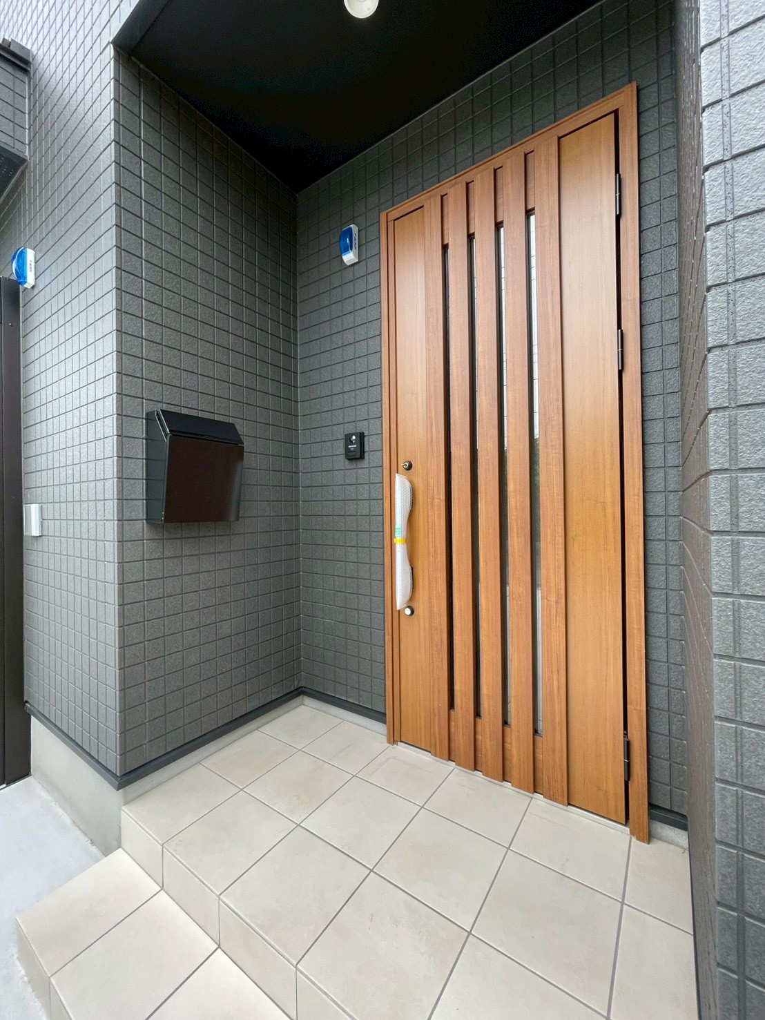 落ち着いたグレーのタイルに木目の玄関ドアが映える外観。
