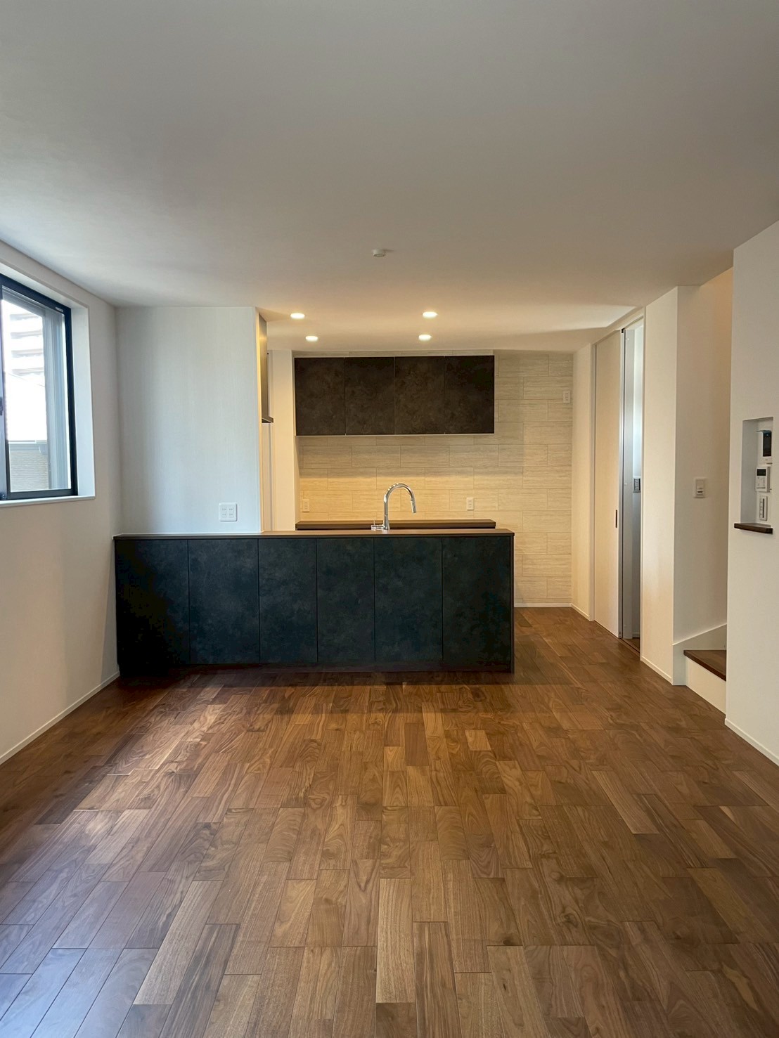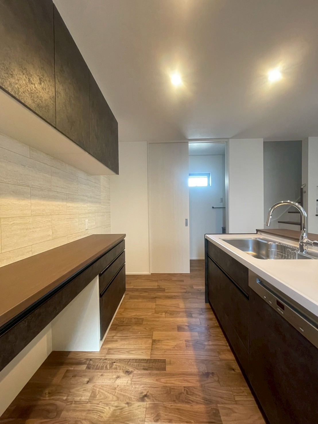 落ち着いたウォールナットの床に、ブラック×グレージュでまとめたキッチン。