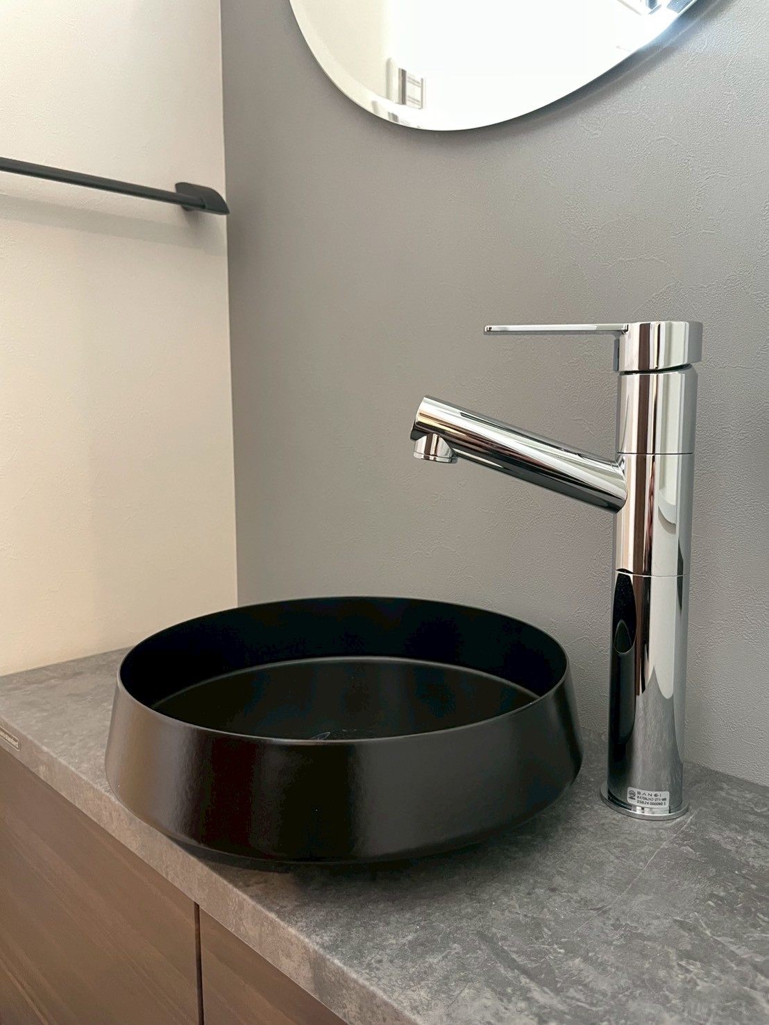 ブラックのボウル洗面や落ち着いた色味のアクセントクロスなど、ディテールまでこだわった大人スタイルの内装で、日常のひとコマが少し特別になる一邸です。