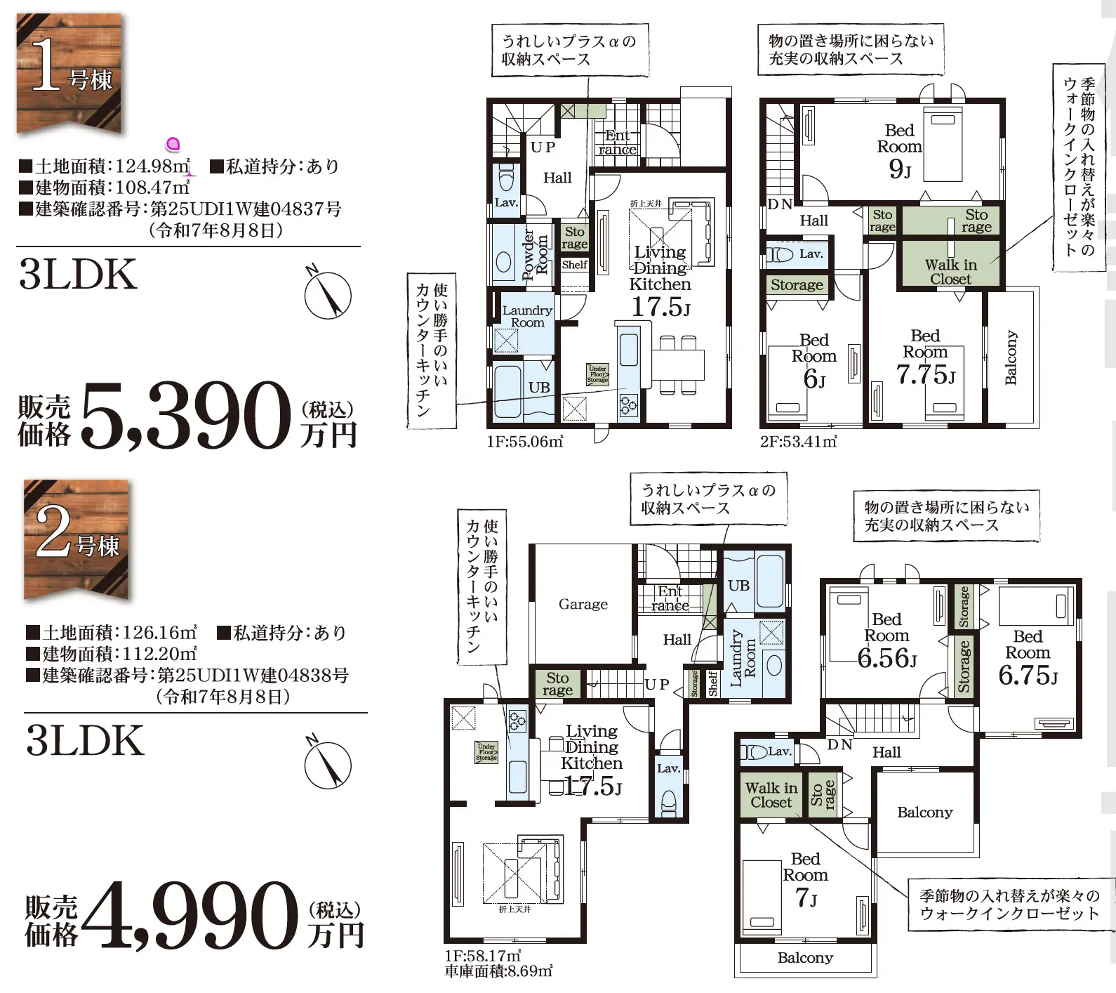 新築住宅 リーブルガーデン 中央区長州2丁目 全2棟 販売価格新築価格 4,990〜5,390万円 New 所在地 千葉県千葉市中央区長洲2丁目30−8 交通 JR外房線 「本千葉」駅徒歩8分 イメージ動画 360°イメージビュー 区画図 区画 1号棟 土地 124.98㎡ / 建物 108.47㎡ 5,390万円 2号棟 土地 126.16㎡ / 建物 112.20㎡ 4,990万円 間取り 現地写真 現地案内図 物件概要 ■所在地/千葉県千葉市中央区長洲2-48-10(地番)・千葉県千葉市中央区長洲2-30-8(住居表示) ■土地権利/所有権 ■地目/宅地 ■総棟数/2棟 ■販売棟数/2棟 ■建物構造/木造在来軸組工法2階建(910モジュール) ■都市計画/市街化区域 ■用途地域/第2種住居地域 ■建ペイ率/60% ■容積率/200% ■設備/東京電力・都市ガス・公営水道・本下水 ■接道状況/北東側4m私道 ■現況/造成中 ■完成/2025年12月中旬予定 ■引渡日/2025年12月下旬予定 ■備考/※広告の取扱いに関しては法令遵守にてお願いします。 ※網戸・照明・濡縁・カーテンレール・防水パン・カーポートはオプションとなります。 ※宅地内に電柱及び支線が入る場合があります。 ※司法書士は、社指定になります。 ※図面と現況に相違がある場合は現況優先とします。 ※全棟が長期優良住宅対象物件です。 印刷図面はこちら